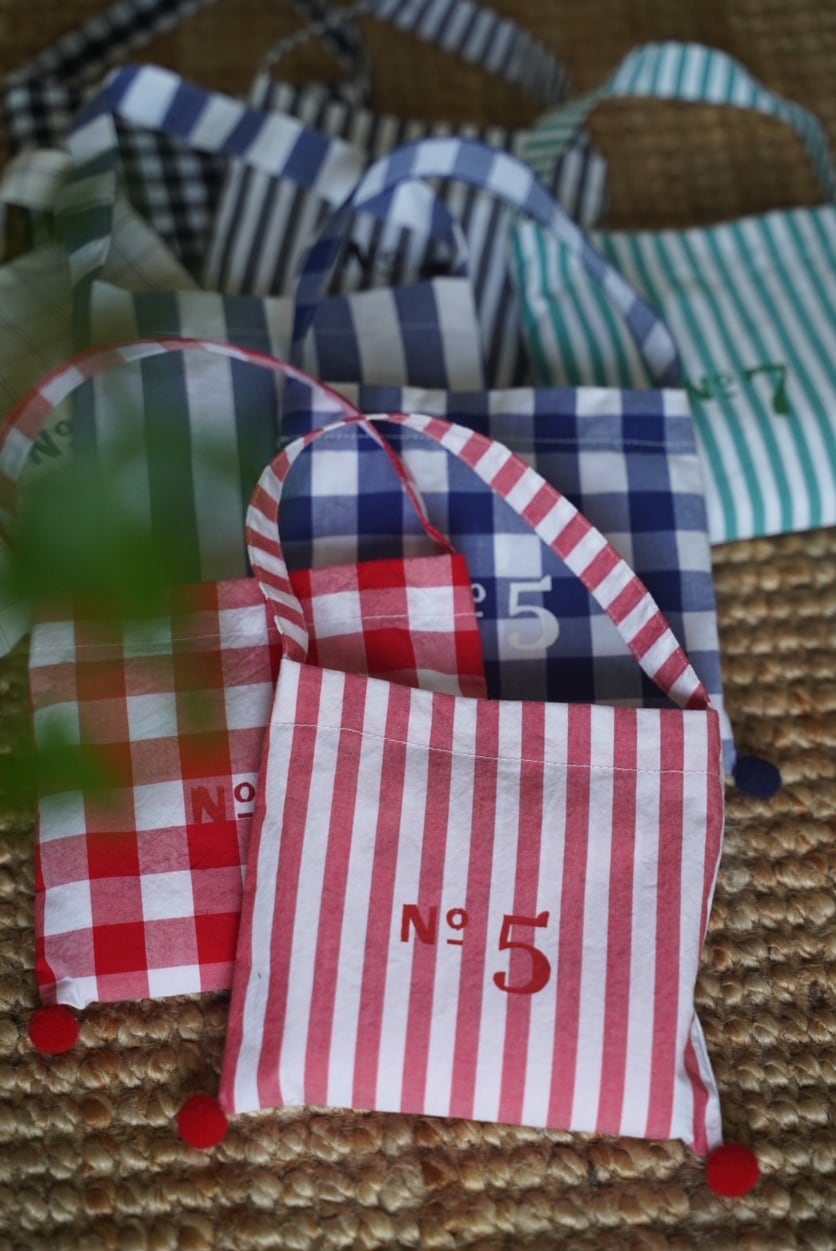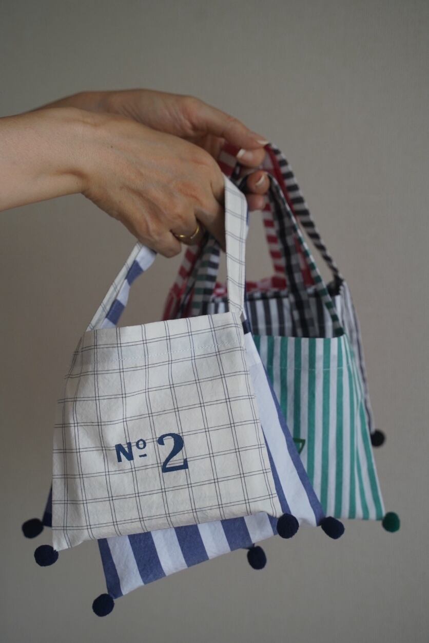 付属のバッグには小さなボンボンで遊び心をプラスしました。